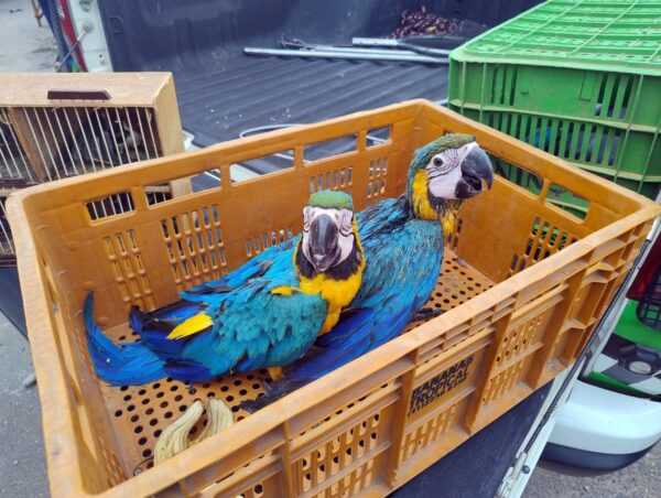 No sábado passado (30) agentes da Inspetoria Ambiental da Guarda Civil Municipal (GCM) de Guarulhos resgataram 18 aves selvagens que seriam comercializadas ilegalmente em uma feira do rolo na avenida Joaquina de Jesus, no Taboão. São duas araras-canindé, dois picharros, seis canários-da-terra e oito galos-de-campina, que foram orientadas para cuidados de especialistas biólogos e médicos veterinários do Centro de Triagem e Recuperação de Animais Selvagens de São Paulo e posterior soltura.