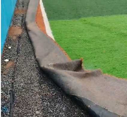 O gramado, em quase toda a lateral, afundou entre e um metro e um metro e meio nesta semana. Os tapetes de grama sintética precisaram ser retirados. O solo tem marcas de afundamento e o muro ameaça cair. O equipamento fica localizado na rua Jacutinga, no Parque Jurema, área dos Pimentas.